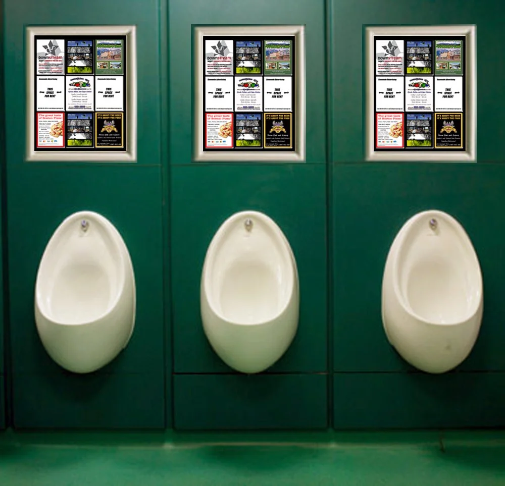 Our advertising frames are placed in high traffic locations: above urinals, on the backs of stall doors, and at hand dryers. This places ads inches from their viewers’ faces, making commode advertising one of the most captive advertising means available.