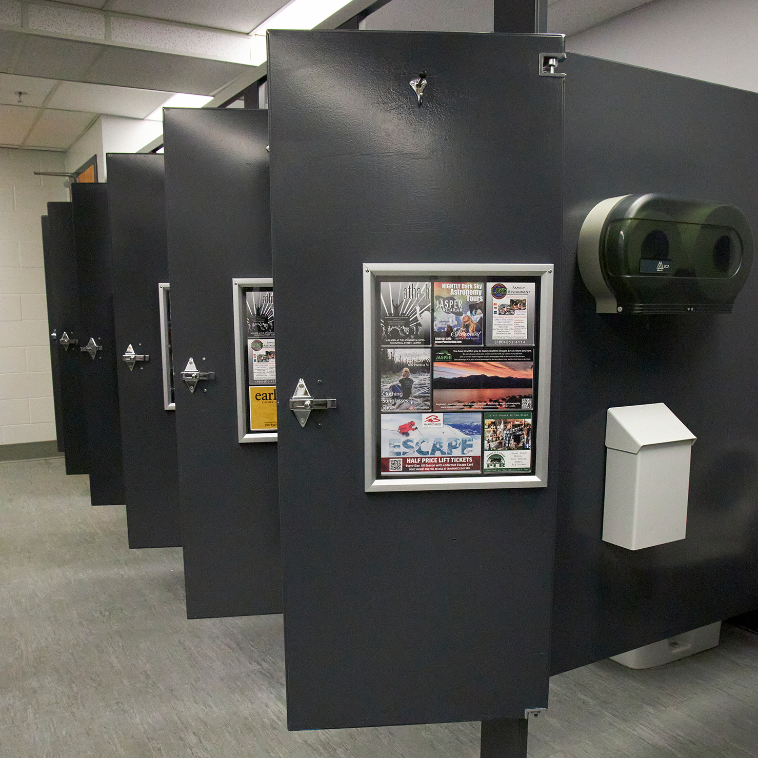 Our advertising frames are placed in high traffic locations, such as above urinals, on the backs of stall doors, and at hand dryers. This places ads inches from the viewer’s face, making commode advertising one of the most captive advertising means available.